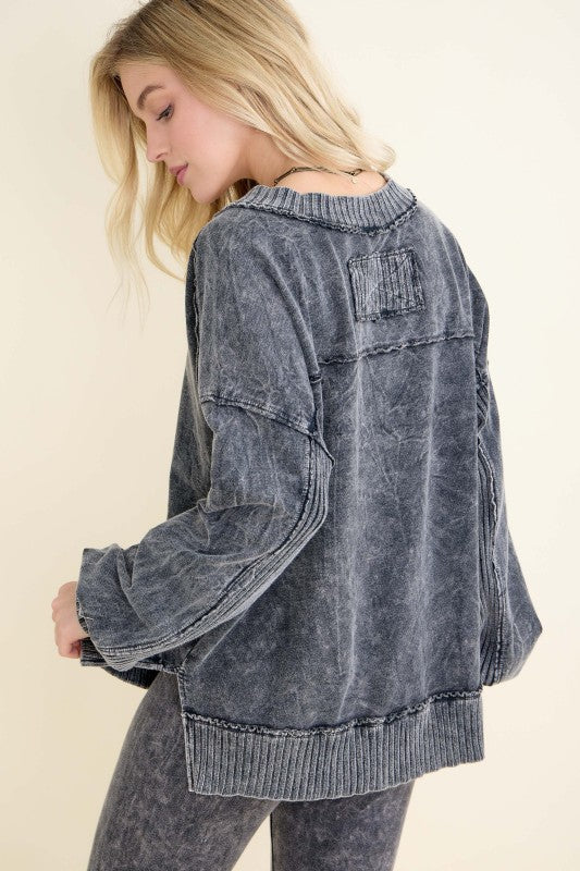 Mineral Washed Ribbed V-Neck Terry Sweatshirt - Ashed Black